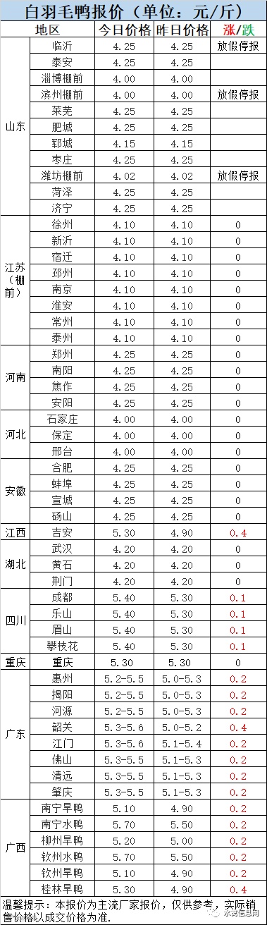 1:近期出栏大鸭为春节期间补栏,数量较少,部分厂家放假停收,市场缺乏主流报价。当前冷藏走货较慢,产品再次下滑,预计开盘后毛鸭价位仍呈弱势。随着回收成本的逐步攀升,冷藏经营风险愈发严峻,刀尖上起舞,不确定性预期增加。