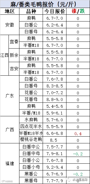 明日麻鸭苗报价稳定,整体仍处于低谷。半番鸭苗报价急转直下下调0.4元/羽。