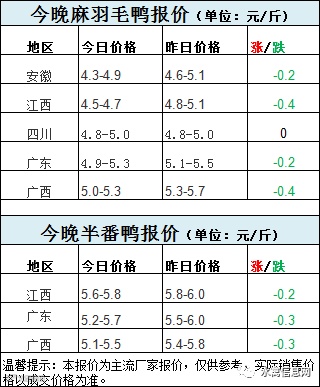 临近八月十五活禽出栏较为集中,叠加白鸭大幅下滑影响,今晚麻鸭报价开始下滑。半番鸭类价格弱势,下调不断。