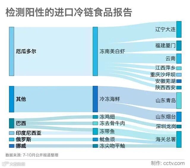 最初,出现阳性的样本多为厄瓜多尔冻南美白虾。自8月开始,冻鸡翅、冻去骨牛肉、冻带鱼等逐渐出现在名单上,来源地从遥远的巴西和挪威一直延伸到与我国接壤的俄罗斯。