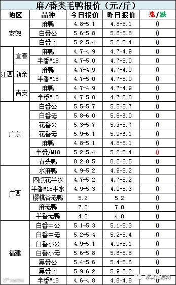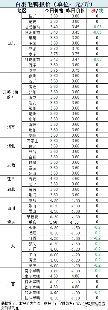 广东地区近期供需两端博弈剧烈,今晚报价继续下调。广西地区旱鸭下滑调整。
