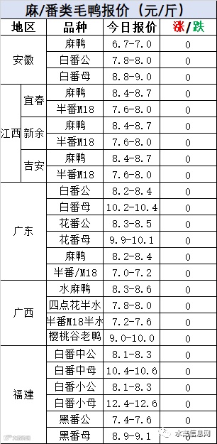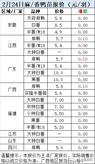 明日麻鸭苗继续上涨0.10元/羽,半番鸭苗报价稳定。