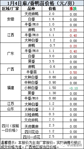 一、2021年1月4日白羽鸭苗报价;