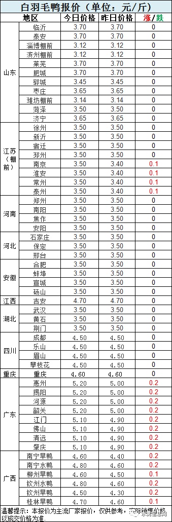 1:近期冻品持续走弱,对毛鸭价格走势带来加多不利影响。今晚分割鸭区域整体报稳,部分南调大鸭价格略升。。