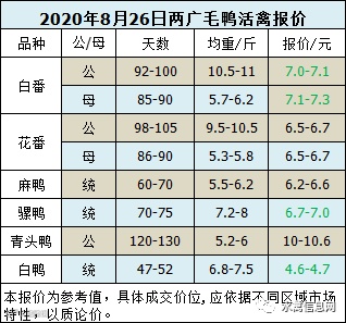 2020年8月26日晚至27日毛鸭报价