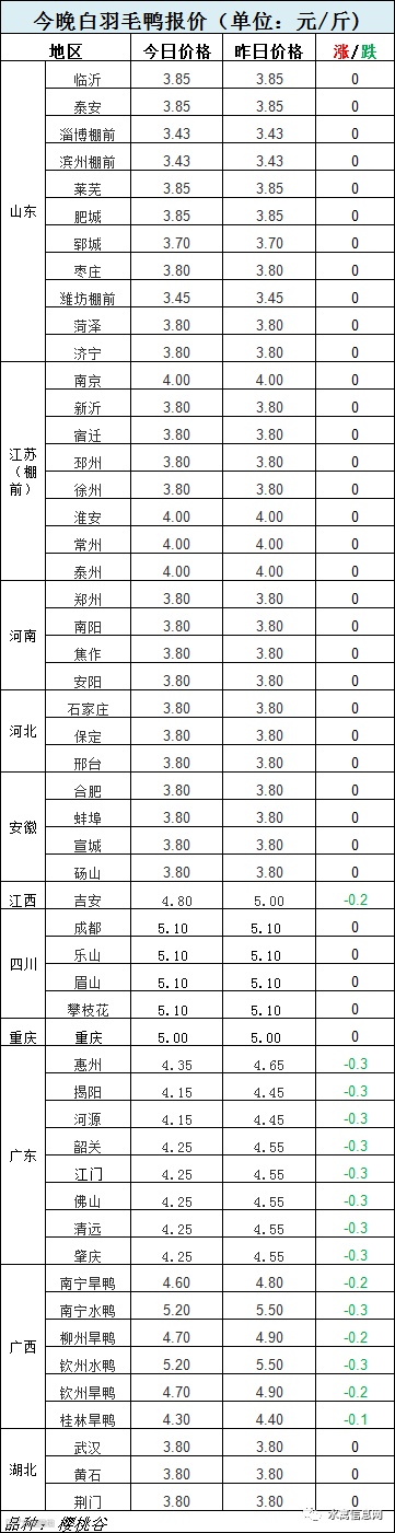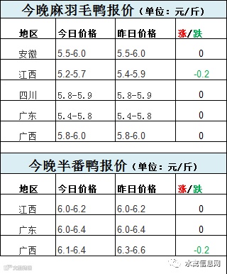 今晚麻鸭、番毛鸭报价整体弱势,受白鸭大幅跳水影响,局部开始下滑。