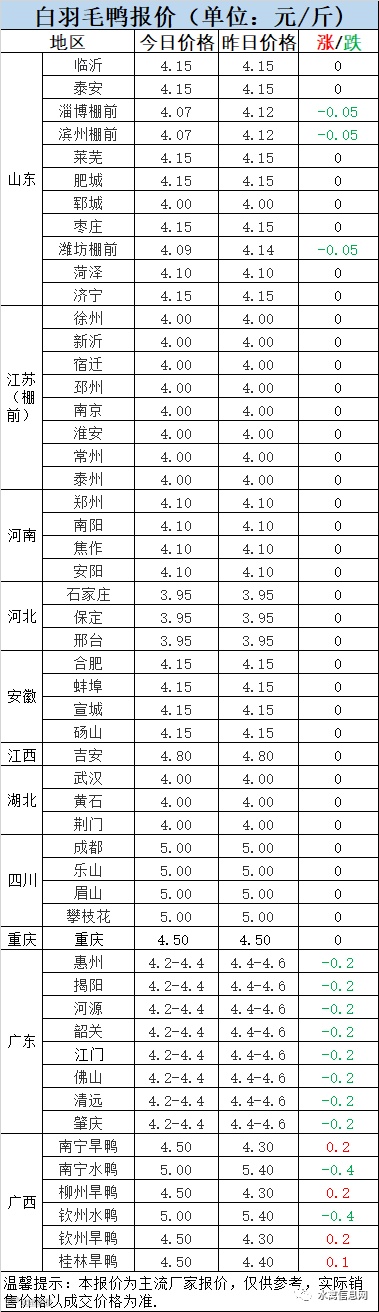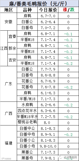 2:南方活禽区域今晚报价弱势调整,节后消费下滑,需求疲软,广东区域机构报价下调0.2元/斤,广西旱鸭恢复性上涨,水鸭受消费影响下滑调整。