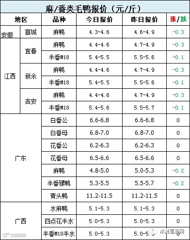 临近八月十五活禽出栏较为集中,叠加白鸭低价影响,麻鸭与半番鸭类价格持续弱势,下调不断。