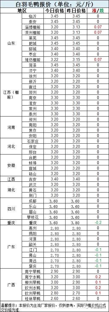 明日白鸭苗报价除广西稳定外,其他区域下调0.1-0.2元/羽不等。