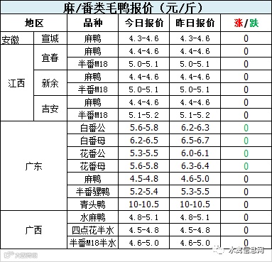 两广活禽连续下滑,养殖端深度亏损。受白鸭下滑影响,今晚麻鸭半番鸭报价持续弱势。