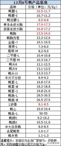 一、12月8日晚至12月9日 白羽肉鸭报价