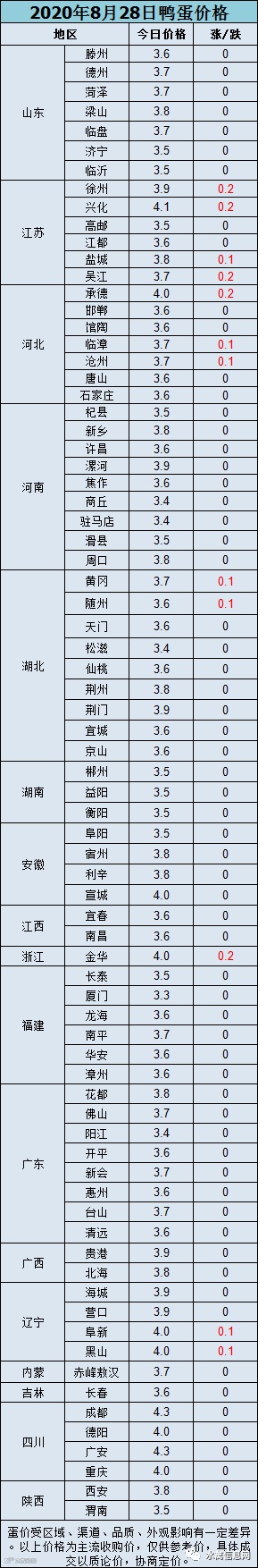 【鸭蛋价格】2020年8月28日鸭蛋报价,稳中上涨。