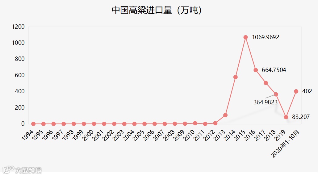 海关总署最新发布10月粮食进出口数据,其中高粱进口跳增很大,前10月中国累计进口量达到402万吨,同比增加449.2%,引起了市场高度关注。