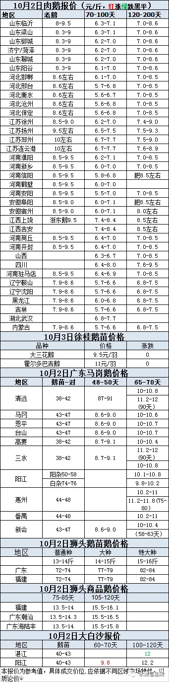 一、10月2日晚至3日 白羽肉鸭报价