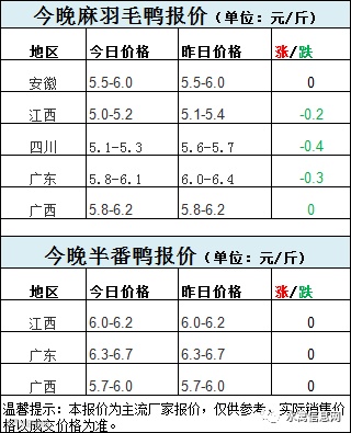 节后活禽区域价格涨跌不一,受白鸭价格连续回调带动,麻番类走货加快但价格依然弱势。今晚报价半番类稳定,麻鸭大面积下滑。