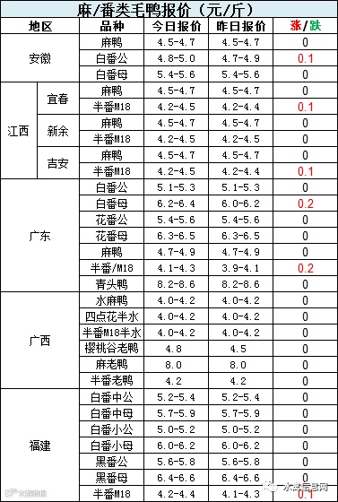 今晚活禽区域麻鸭/半番报价整体稳定,局部涨跌调整。