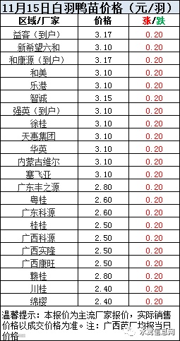 明日白鸭苗报价普遍上涨0.2元/羽。当前白鸭苗,出苗略有减少,孵化连续拉升,苗价突破3元大关。