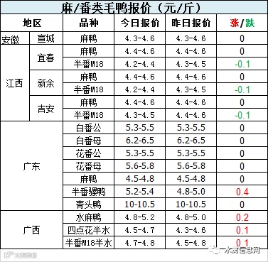 今晚麻鸭/半番鸭报价涨跌不一。白鸭底部拉升,带动麻鸭/半番局部上调。
