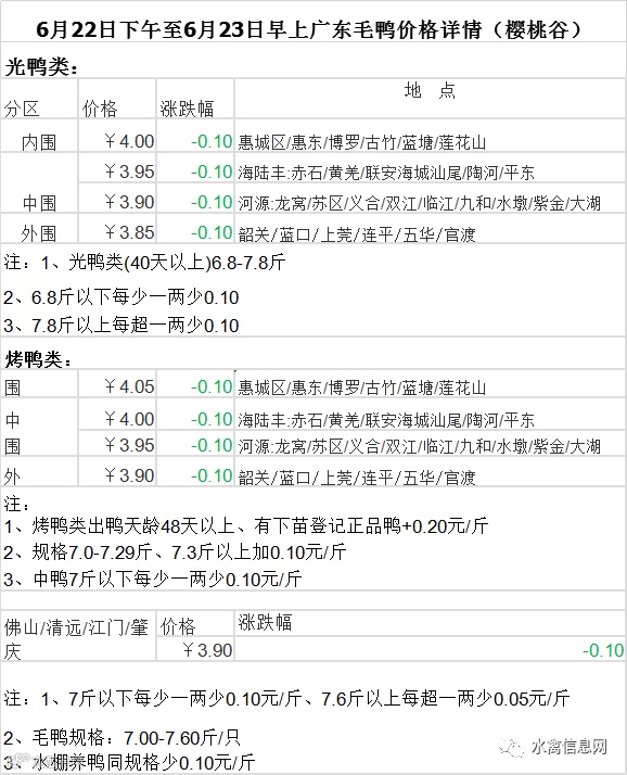 | 钦州水鸭 | 4.70 | 4.60 | 0.1 | |
