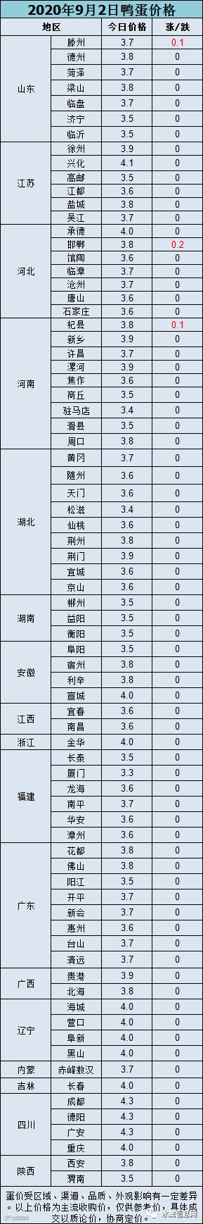 【鸭蛋价格】2020年9月2日鸭蛋报价,稳定为主。