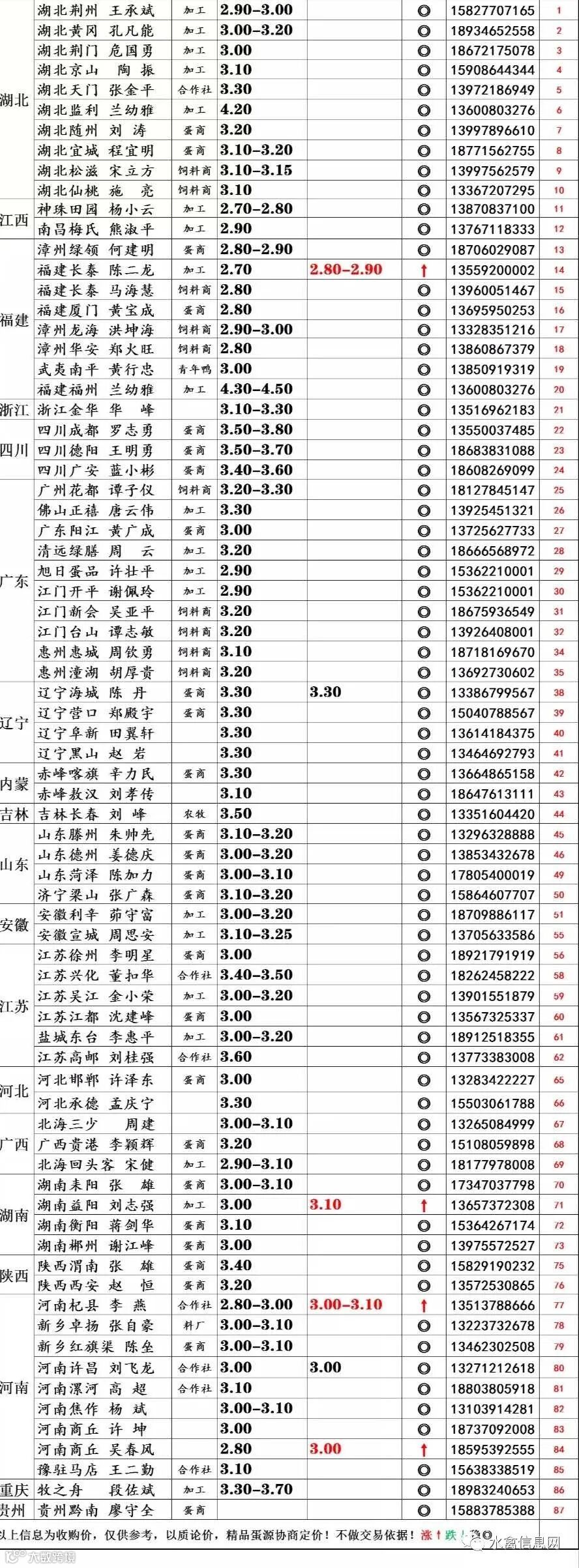 | 蛋价受蛋形、蛋重、整洁度影响,以上价格为参考,具体成交以质论价,协商定价。 |