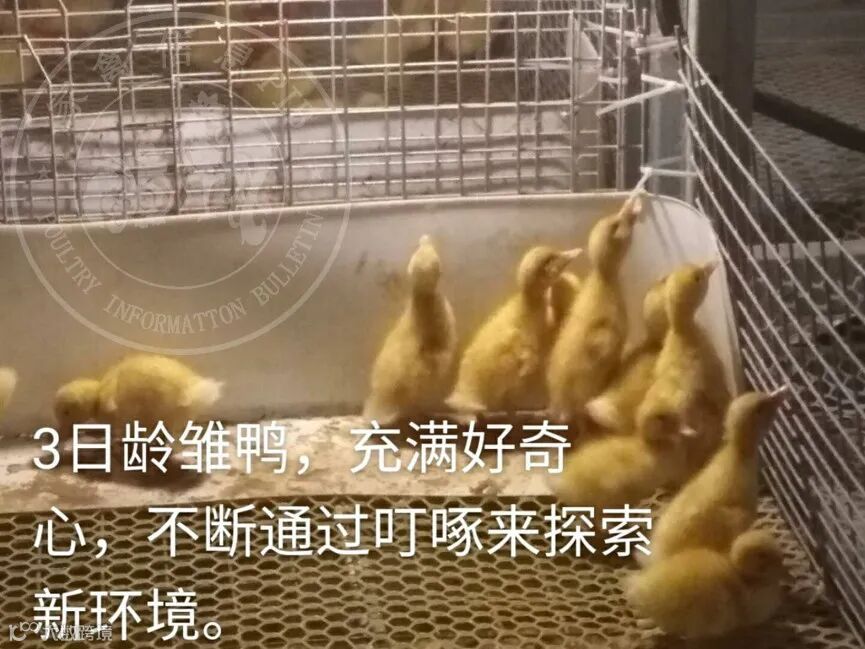 3日龄雏鸭,已经完全适应了棚舍内环境,开始变得活跃起来,在棚内会有规律的结队奔跑,会不断通过叮啄来探索辨识周边事物。此时是建立良好抗应激能力的时期,养殖人员应多在棚内说话,制造一定的响动,让鸭群逐步的认识饲养人员的声音和动作并建立与人的互动关系。能有效减免中后期棚内操作带来的应激反应。