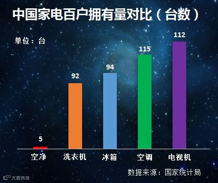 新风系统的市场处于刚刚起步的阶段,因为与英国、德国、美国相比,中国新风系统的普及率非常低,这就是市场!而从中国家电百户拥有量来看,电视、空调、冰箱、洗衣机基本都已经饱和了,但是新风才刚刚开始。