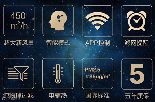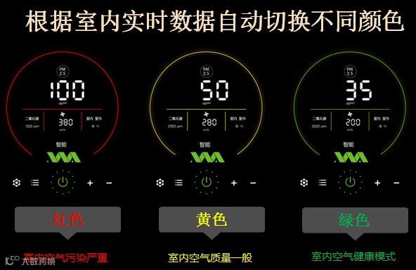 我们的新产品“银河A450”能根据室内实时数据自动切换不同颜色,三种不同的颜色会非常直观地显示室内空气质量。它通过判断目前室内空气状态自动调整自身运行的模式,判断是通过两个主要指标,一个是颗粒物浓度(即室内的PM2.5),它决定了机器新风量到底是多大;第二个指标是二氧化碳浓度,新风机通过判断室内二氧化碳浓度调整引入的新风和内循环。