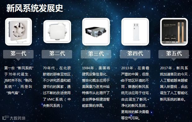 新风包含两层含义:一个是通风,一个是净化。具备通风和净化功能的、带有机械助力的一套空气循环系统就可以被称为新风系统。第一代新风系统就是排风扇;第二代是中央新风系统;再到后来这个产品逐渐标准化、产品化,成为第三代;第四代产品是柜式的或者壁挂式为主的机器,这种产品实际上是因为中国市场的特殊情况而产生的,所以严格讲它在中国市场是第四代,它改变了传统中央新风的安装方式,虽然是个小小的变化,实际上它对产品的功能、安装、使用以及在前期销售、中期使用、后期维护方面都发生了深刻的影响,它非常适合中国雾霾的国情;第五代产品是人工智能化新风系统,它跟以前的柜式新风机有比较大的不同。