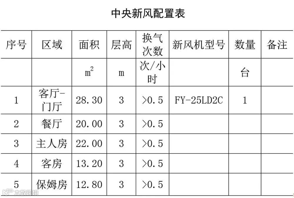 新风换气次数决定新风量,也决定新风型号的选用,一般情况下,设计师会根据新风换气次数以及房屋面积、层高所计算出来的新风换气量来选择新风的设备型号。在住宅新风系统中,新风换气次数一般取值在0.5次以上,以下是某地三房两厅新风换气次数实际应用。