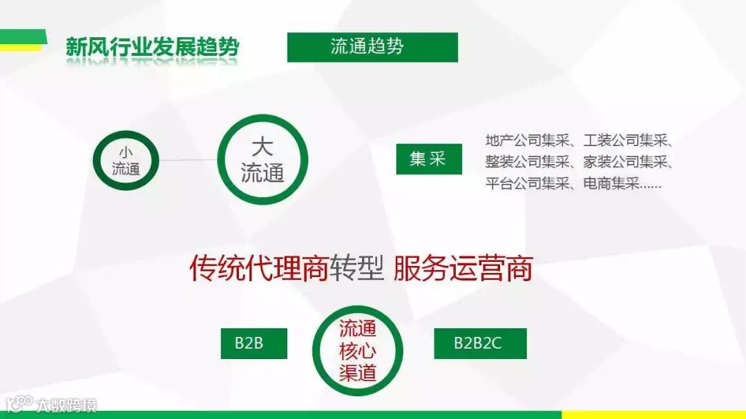 还有一个大家比较关注的是我们的流通趋势,从小流通到大流通,地产公司、工装公司、整装公司、平台的大量集采,那么我们传统代理商将会转型到服务运营商,这都是摆在我们面前的问题。