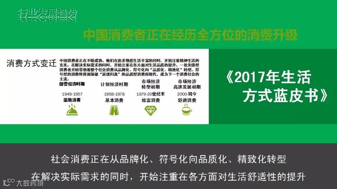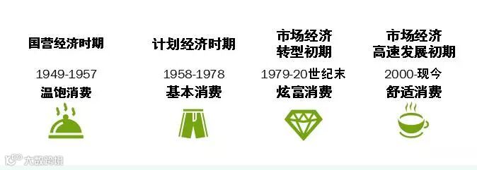 中国消费者目前正处于全方位消费升级阶段——1949年到1950年我们是温饱消费,1958年到1978年是基本消费,1979年到20世纪初的是炫富消费,2000年至今是舒适消费。