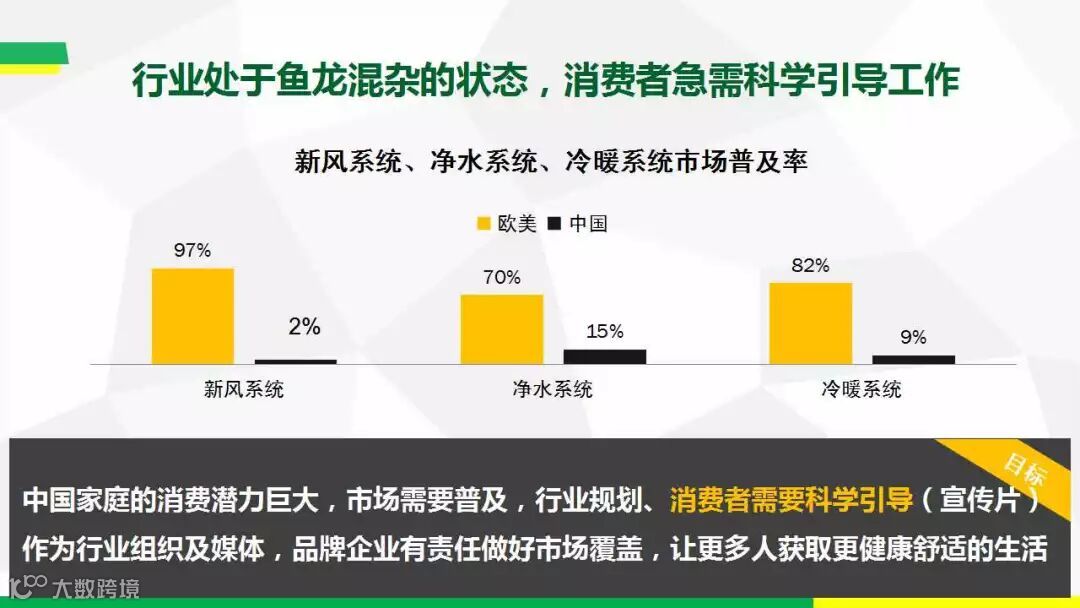 据了解,新风系统的市场份额在美国占97%,中国占2%;净水系统欧美占70%,中国占15%;冷暖系统欧盟占82%,中国占9%。