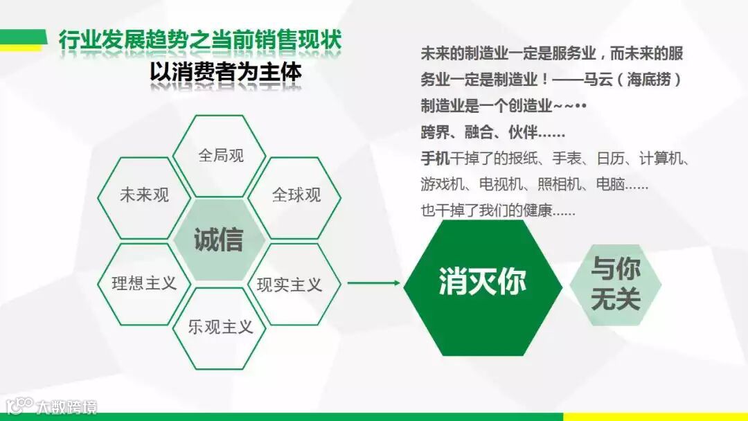 一个人没有信用就这样,一个行业没有信用又会带来什么?那就是消费者对这个行业失信,要重拾起来非常难。所以做企业要有诚信,这上面的三观,是马云开会的时候提出的一个观点——未来观、全球观、全局观。