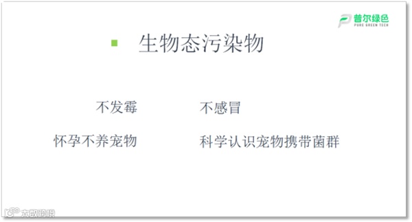 还有第三大类污染物,比较简单,是生物态的污染物。原先业主要求室内不发霉,但是现在的客户已经从要求不发霉变成要求屋里的人不感冒。还有从怀孕拒绝养宠物,到科学的认识宠物身上携带的菌群。按照我们常人的这种思维,中国人对养宠物相对来说比较排斥,这跟西方的欧美国家形成鲜明对比,我们可能在比较薄弱的时候,比如说感冒、怀孕、孩子比较小的时候,对宠物有敌对的心态。但是你们上网去查看那些很萌的广告,小孩跟一只大狗抱在一起,这是在美国家庭当中常有的家庭结构。但是在中国没有,因为我们的人均居住面积远远小于美国人均居住面积。所以我们通风的能力,人均占有的空气体积也远远小于美国居民。这就意味着什么?意味着如果不通风,你的宠物身上的病菌、细菌、病毒很可能就会被传染到人身上,或者是在宠物身上得到积攒,最后发生病变。