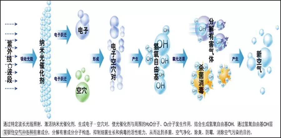 净化原理:在光源照射下,光触媒能够利用特定波长光源的能量产生催化作用(氧化还原反应),使周围的氧气及水分子激发成具高活性的自由基,这些自由基,也有说法叫“光等离子体”,几乎可分解所有对人体或环境有害的有机物质及部分无机物质。光触媒(Photocatalyst),也称为光催化剂(Lightcatalyst),是一类以二氧化钛(TiO2)为代表的,在光的照射下自身不起变化,却可以促进化学反应,具有催化功能的半导体材料的总称。