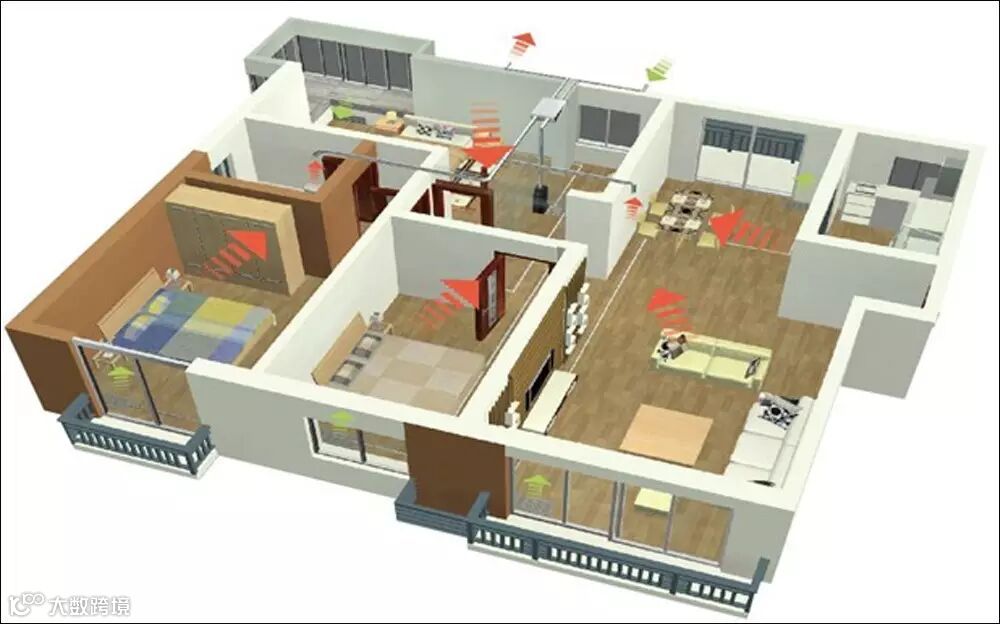中央空调:中央空调的作用是只给室内调节温度,而不能使室内外空气进行交换,空调的室内外换气率只有8%左右。