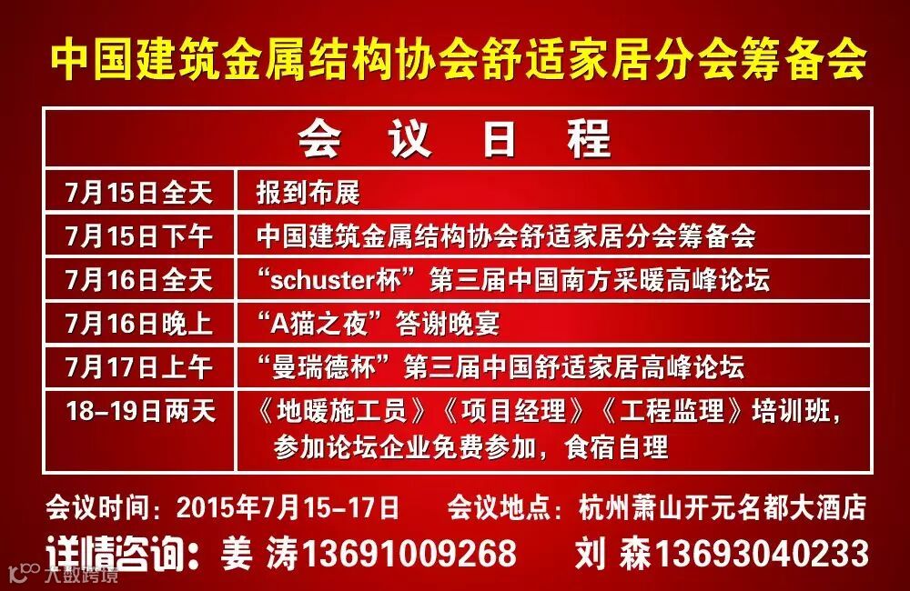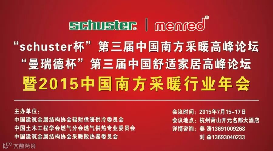 “schuster杯”第三届中国南方采暖高峰论坛 “曼瑞德杯”第三届中国舒适家居高峰论坛暨2015中国南方采暖行业年会将于7月15日—17日在杭州萧山开元明都大酒店隆重召开。南方采暖高峰论坛参展企业50多家,预计参会800人。15日全天报到布展,16日全天、17日上午高峰论坛,已报名企业请提前订票,暑假期间,车票、机票紧张,千万莫误!未报名企业可一同前往,现场报名,杭州周边地区集成商、施工企业可免费参观展览。特此提醒!!!