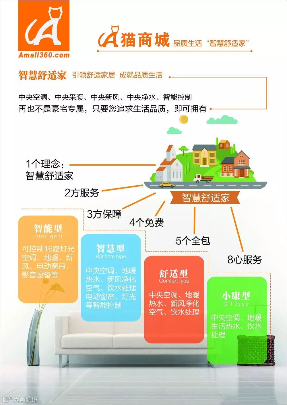 今天互联网已经成为我们的信仰,但怎么才能够把信仰落地,A猫商城将其与智慧舒适家居系统完美结合,隆重推出A猫商城“智慧舒适家”8个套系集成产品,包含小康型2个套系、舒适型和智慧型各3个套系产品。该套产品可谓A猫商城目前为止推出的最高效、最便捷、最实惠的解决智慧舒适家居系统集成方案的产品。其价格亲民(368元/㎡起),客户只要下一个订单,中央空调、地暖、生活热水、净水处理……全套产品及服务都齐了,而且产品明细皆清楚明白、有据可依。物超所值的“智慧舒适家”产品让客户省的不只是金钱,还有时间,让客户能够轻松便捷地将品质生活带回家。