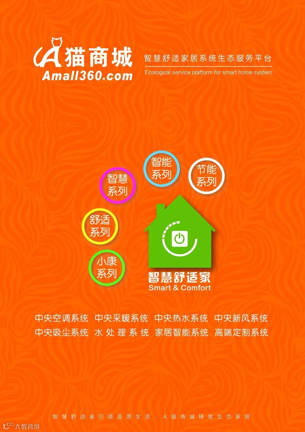 作为智慧舒适家居系统生态服务平台,A猫商城致力于为客户提供量身定做的智慧舒适家居系统的整体解决方案,全方位地为客户提供咨询、设计、销售、施工、监理、售后及线上与线下的互动服务;与智慧舒适家居行业企业一起分享市场开发、营销管理、技术共享、设计报价、工程管理、一站式采购及售后服务的创新模式和标准化;为设备、材料的生产商提供最前沿的客户需求、最快捷的推广渠道和分销平台。