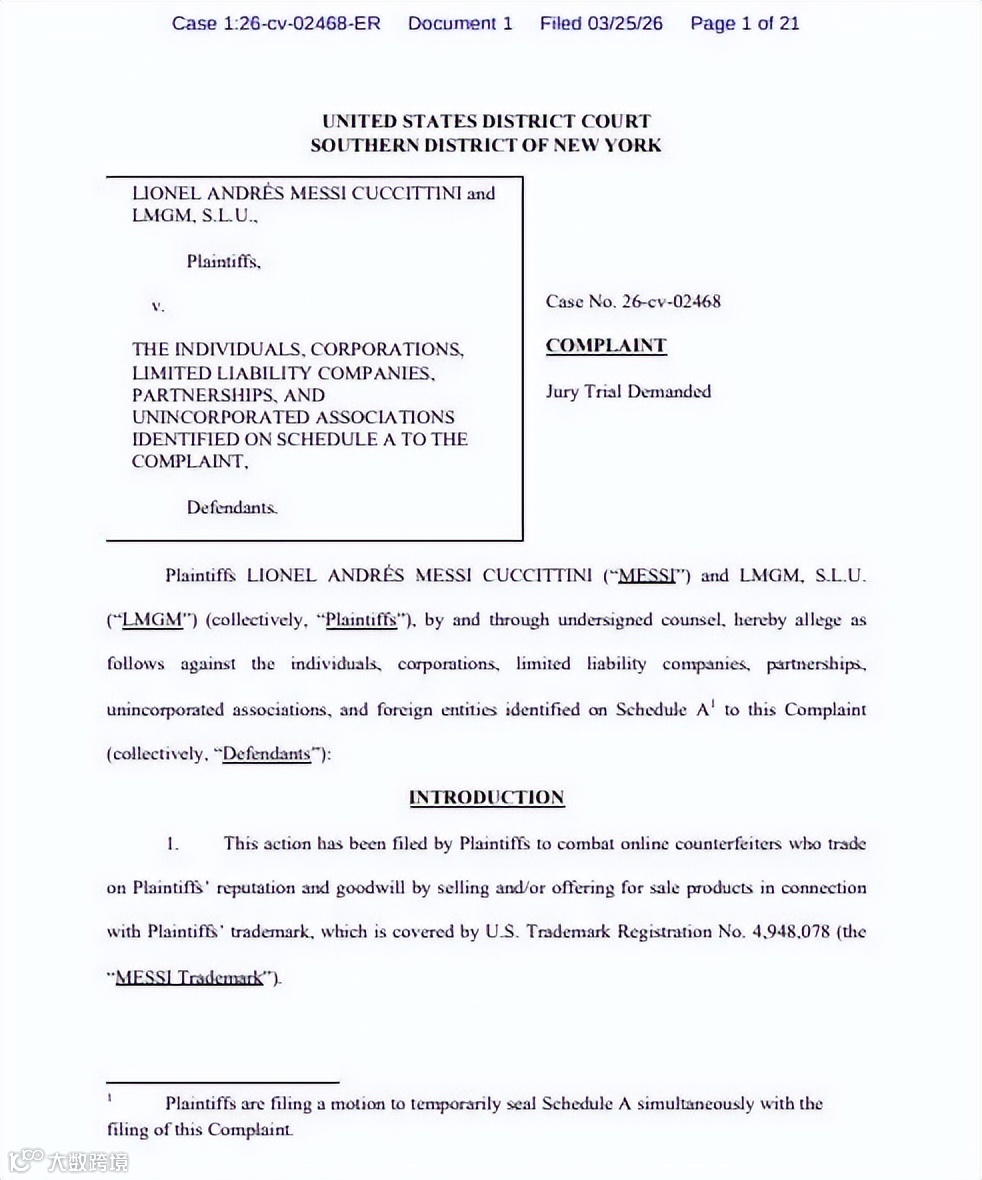 据海外媒体报道,3月25日,梅西通过自己的品牌管理公司LGMG,向美国纽约南区联邦法院提起诉讼,控告Temu、Shein、Walmart等平台上的中国跨境电商卖家大规模销售侵权商品并伪造其个人品牌标识。