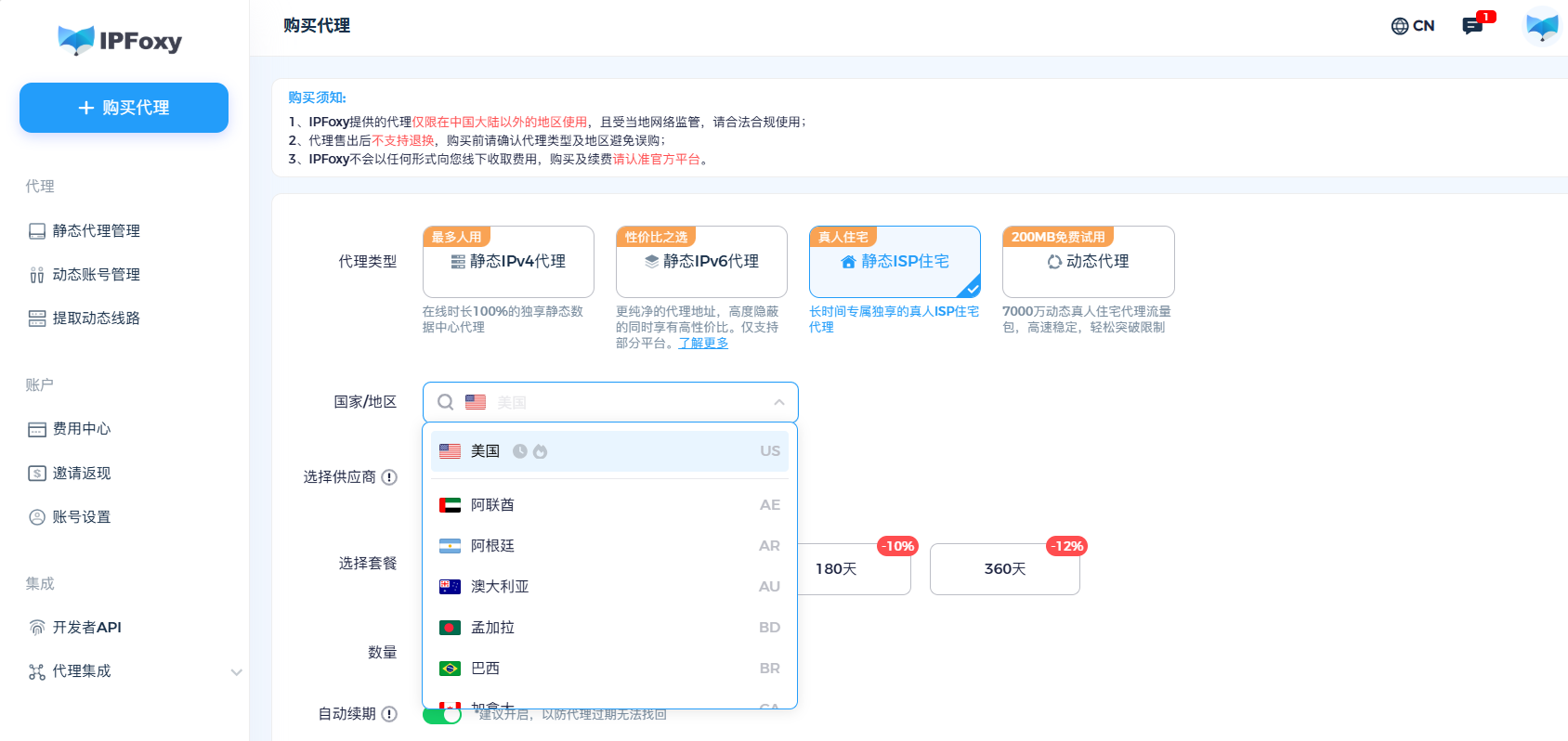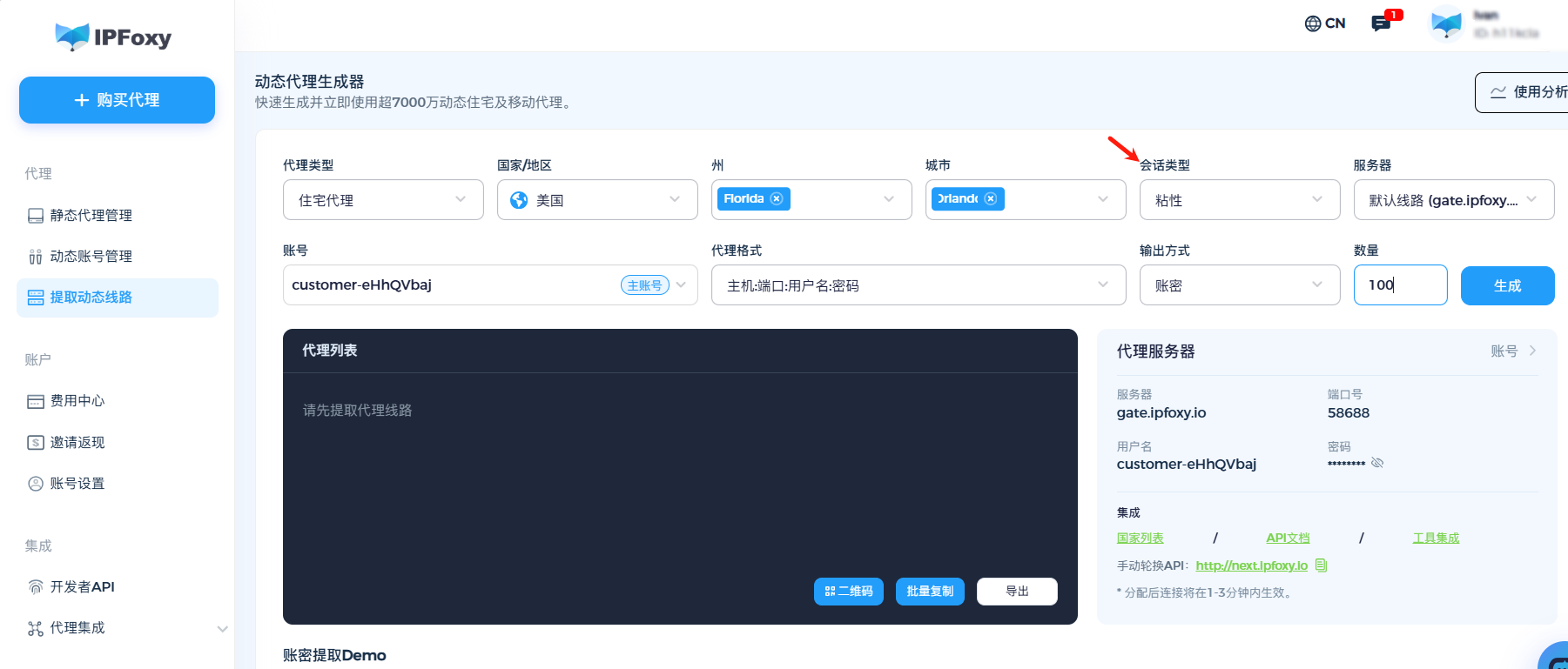 获取代理信息:选择建议选择与目标演唱会同一国家/城市的IP出口,并获取代理端口、协议等代理信息。