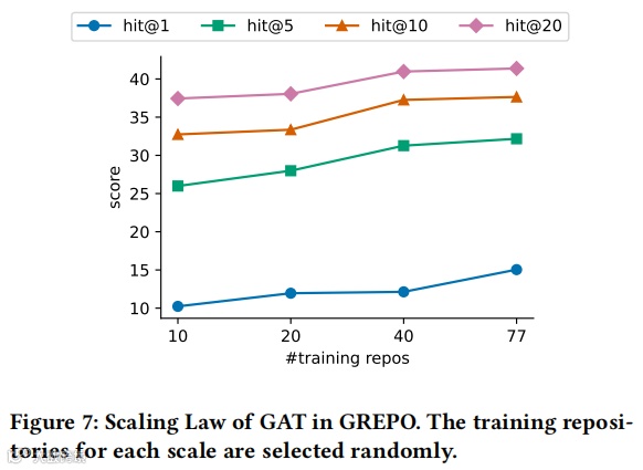 图注:GAT 模型在 GREPO 上的 Scaling Law。随着训练涉及的开源仓库数量增加(从 10 增加到 77),模型在未知测试集上的命中率稳步提升。