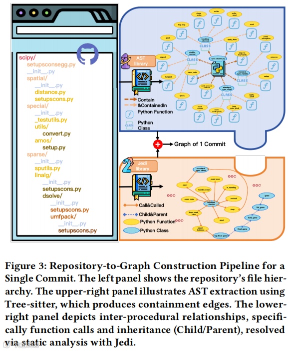 图注:单次 Commit 的代码转图流程图。左侧是文件层级,右上角利用 Tree-sitter 提取抽象语法树(生成包含关系),右下角通过 Jedi 进行静态分析(生成函数调用和类继承关系)。