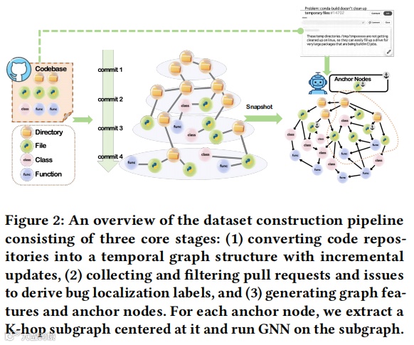 图注:GREPO 数据集的构建流程。从代码仓库的提交历史中提取增量图更新,结合 GitHub Issue(问题报告)和 PR(合并请求)提取真实标签,最后生成适用于 GNN 训练的特征和锚点节点。