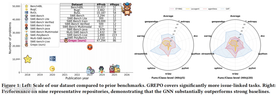 图注:左图展示了 GREPO 数据集在规模上远超以往基准;右图展示了在 9 个代表性仓库中,GAT(图注意力网络)在 Hit@5 和 Hit@20 指标上显著优于强 LLM/Agent 基线方法。