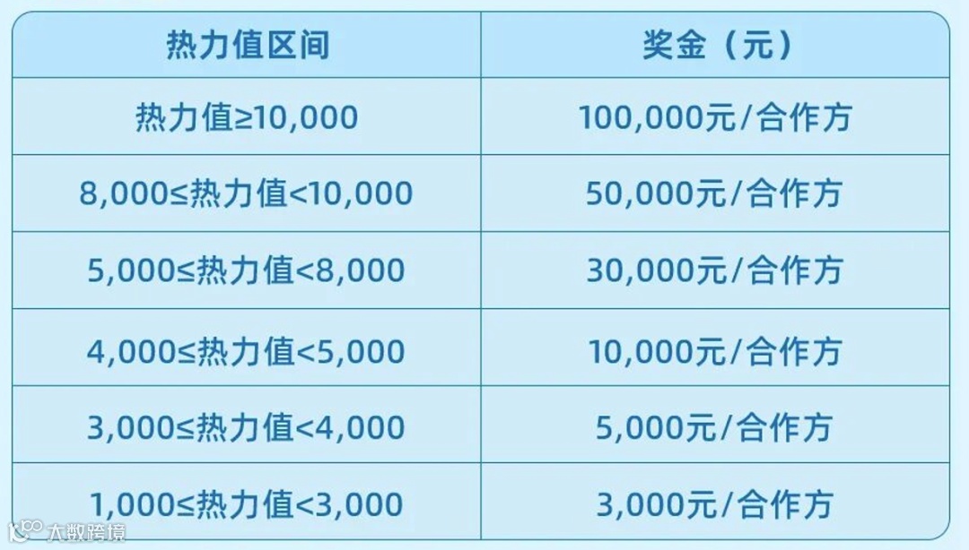 根据规则,合作方的热力值表现直接决定奖金数额,从1000热力值起奖,热力值到达10万及以上的合作方可获得10万元奖金,具体如下: