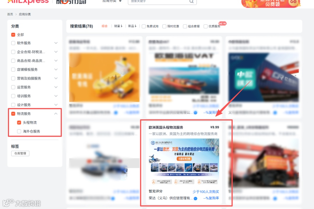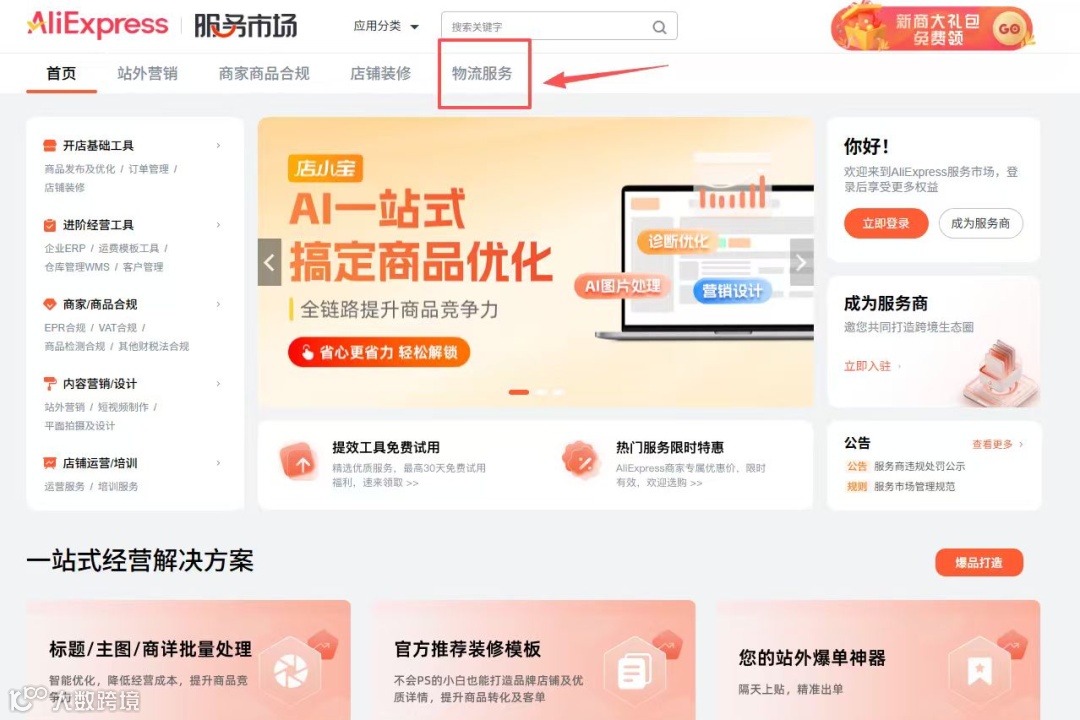 1. 登录速卖通卖家后台,点击“物流服务”进入速卖通服务市场;