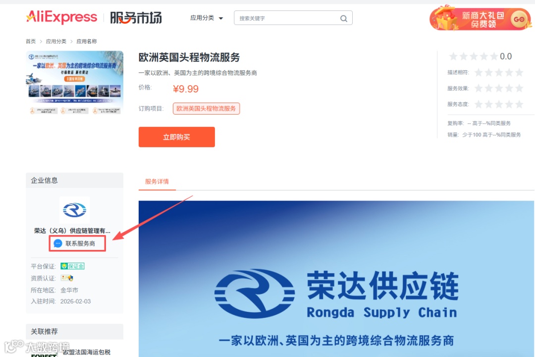 3. 查看服务详情,点击“联系服务商”,即可与荣达专业团队对接,定制专属物流方案。