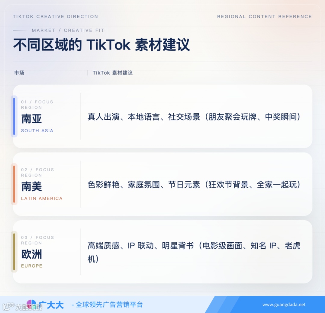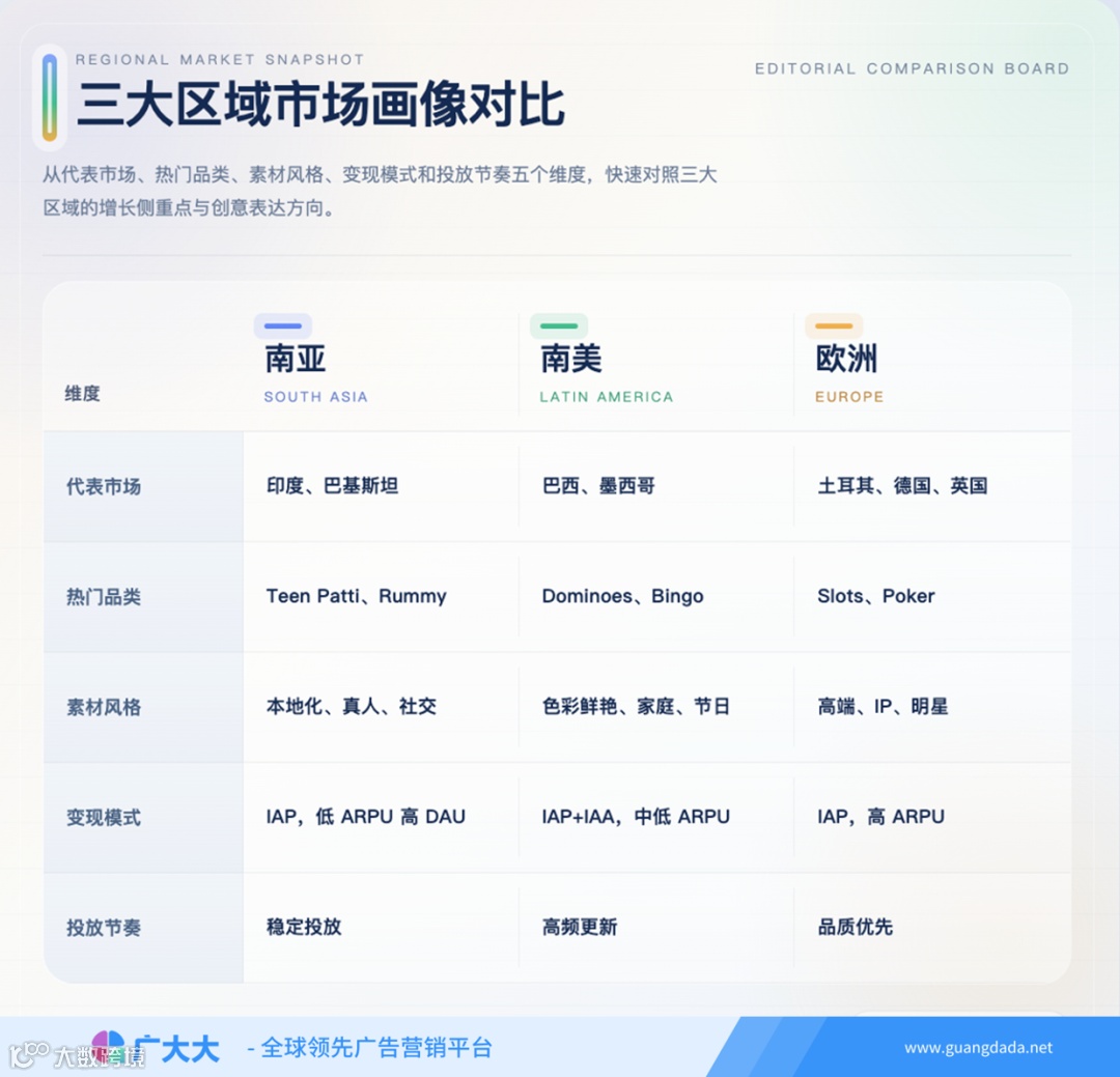 第一,务必分区域定制素材,切勿一套素材通投全市场。三大市场用户偏好差异显著:南亚抓牢“本地化+真人出镜”核心,南美主打“高饱和色彩+家庭社交氛围”,欧洲坚守“高端质感+IP联动”优势,强行通投只会让投放效果大打折扣。